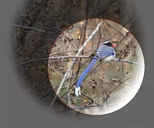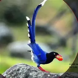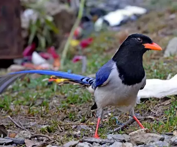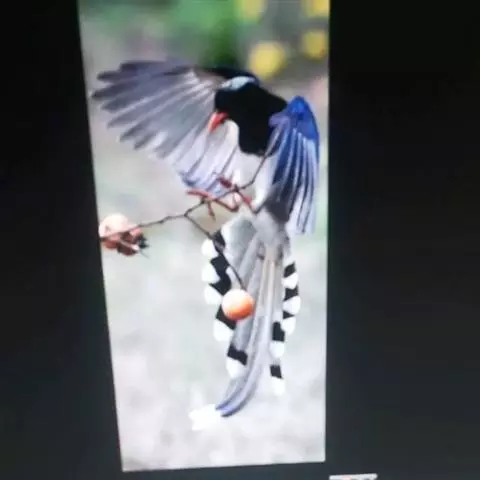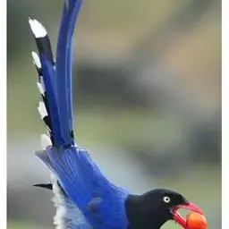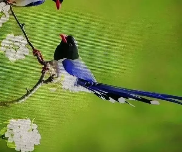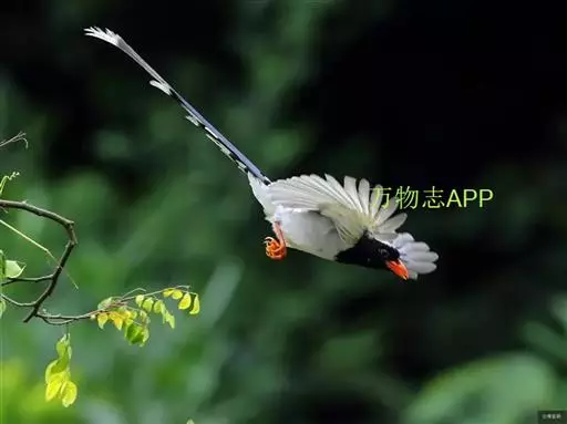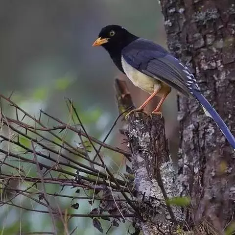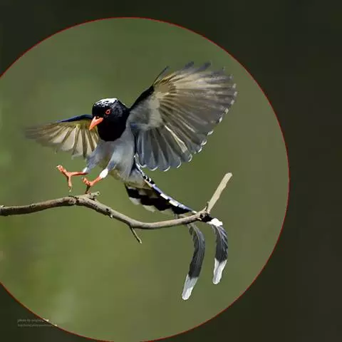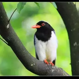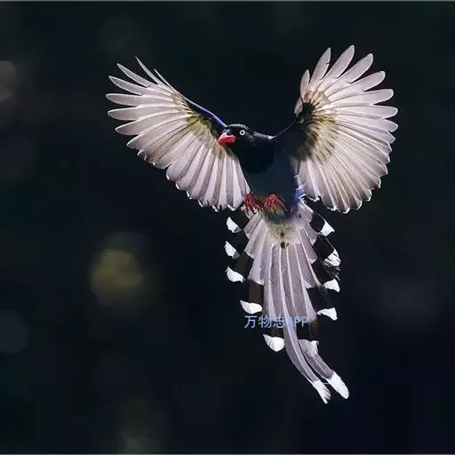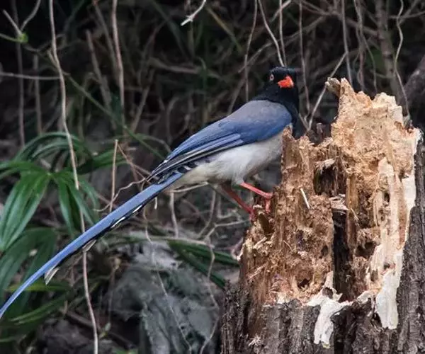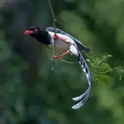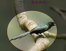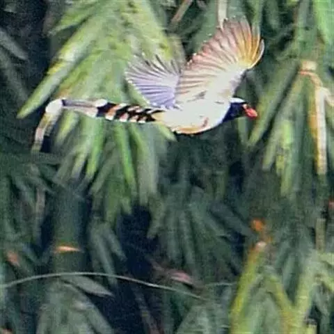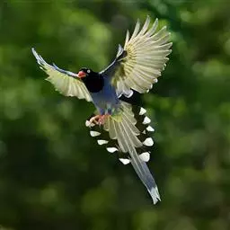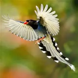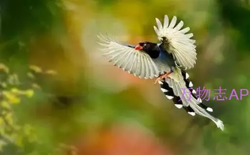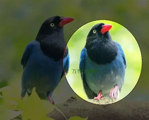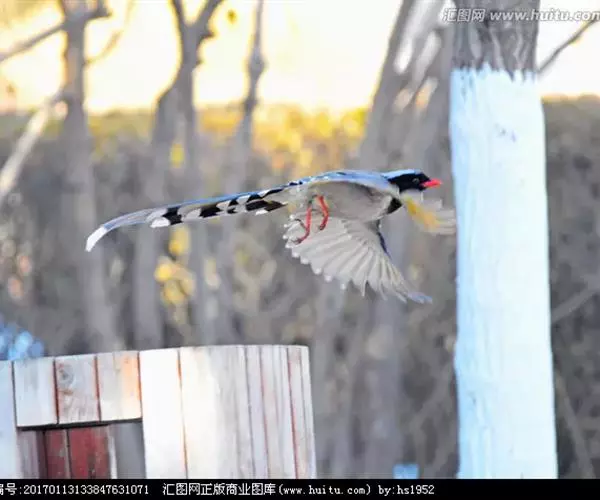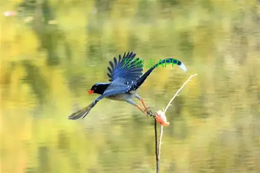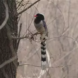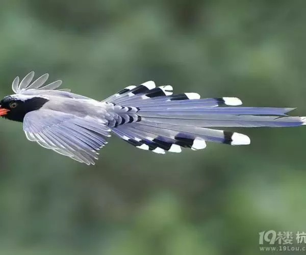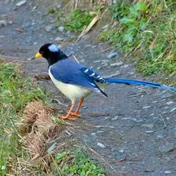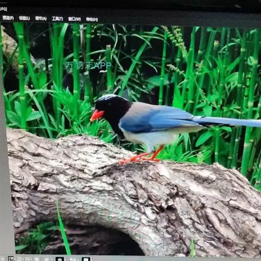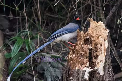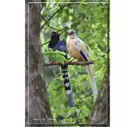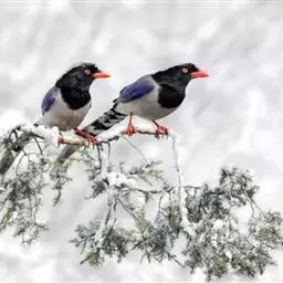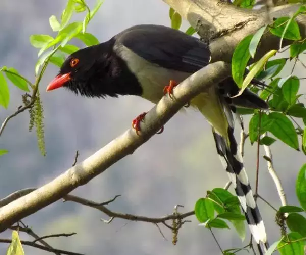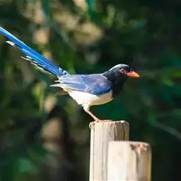 红嘴蓝鹊(学名:Urocissa erythrorhyncha) :是大型鸦类,体长54-65厘米。嘴、脚红色,头、颈、喉和胸黑色,头顶至后颈有一块白色至淡蓝白色或紫灰色块斑,其余上体紫蓝灰色或淡蓝灰褐色。尾长呈凸状具黑色亚端斑和白色端斑。下体白色。 黄嘴蓝鹊外形和羽色和该种非常相似,但黄嘴蓝鹊嘴为黄色,头部仅枕有白色块斑。区别仍很明显,野外不难识别。