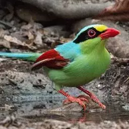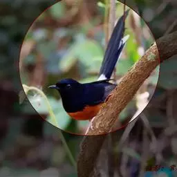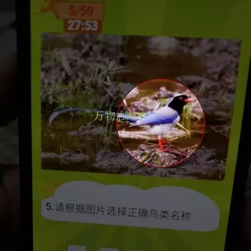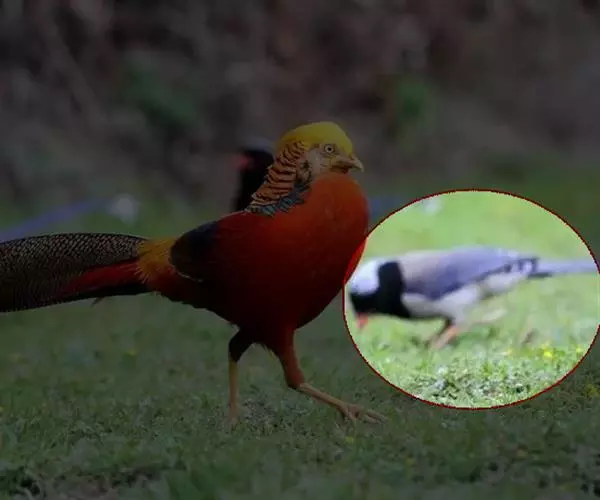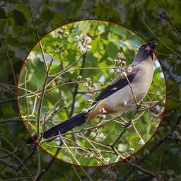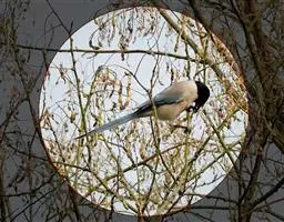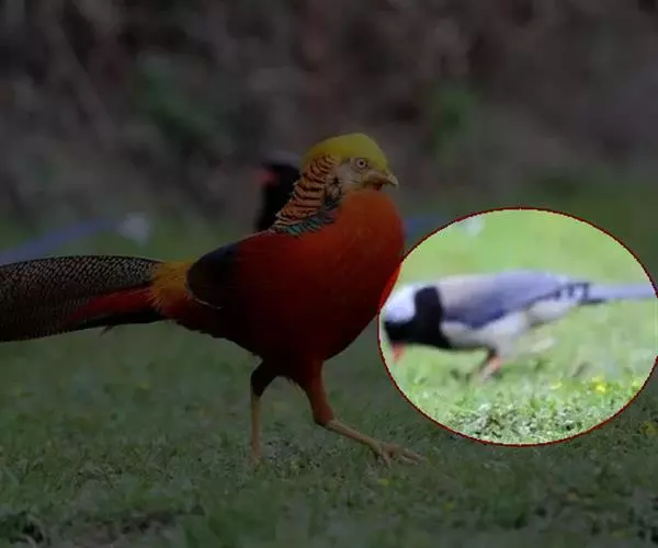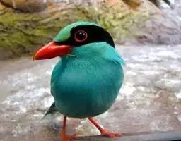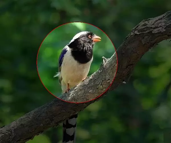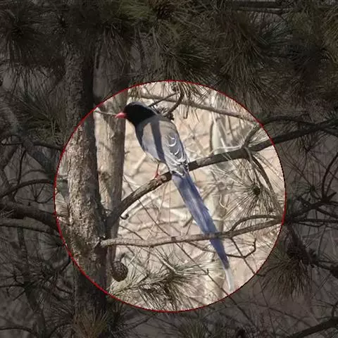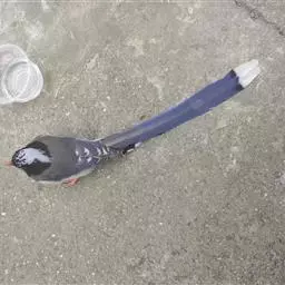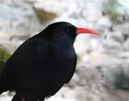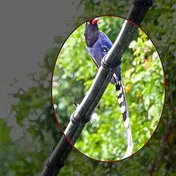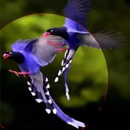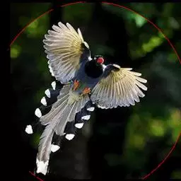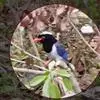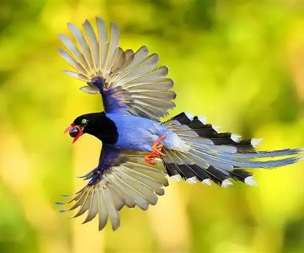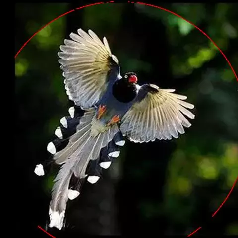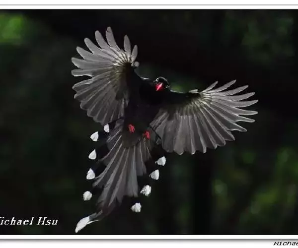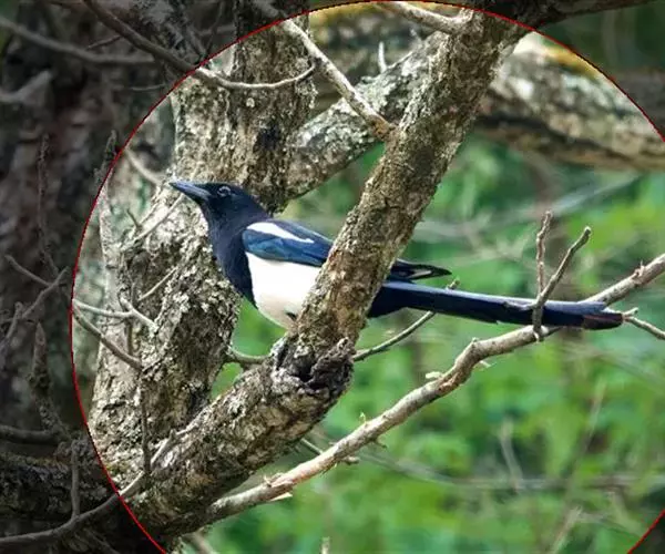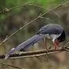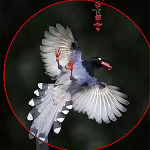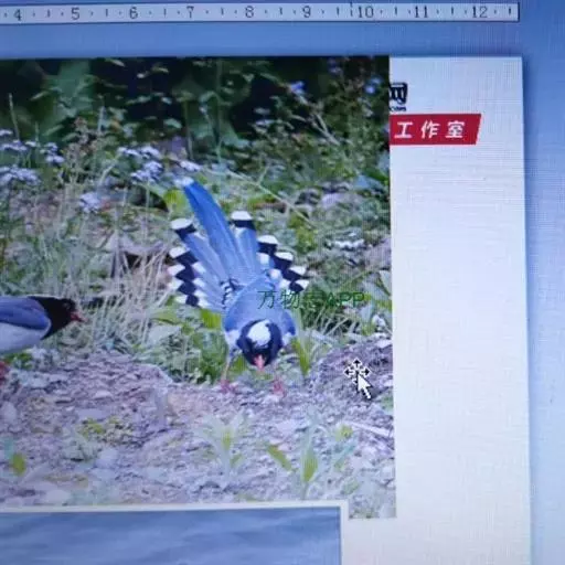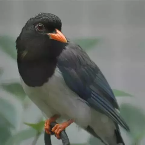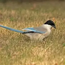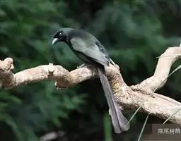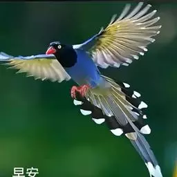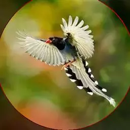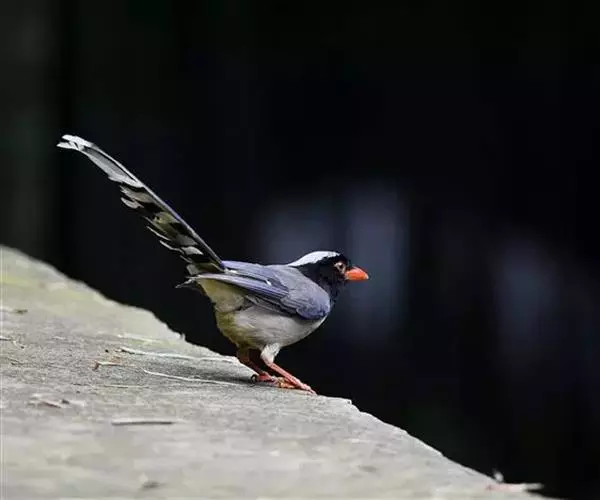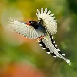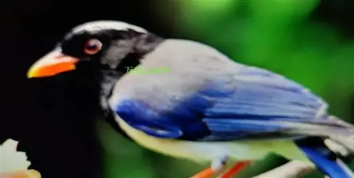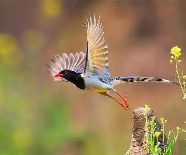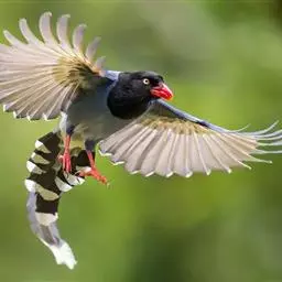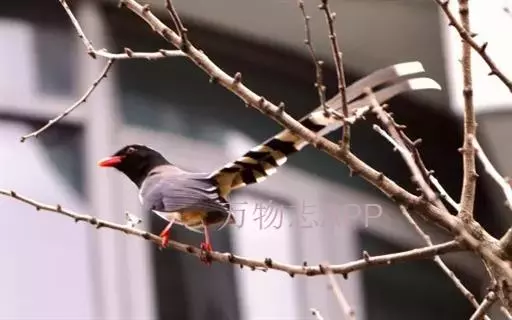 红嘴蓝鹊(学名:Urocissa erythrorhyncha) :是大型鸦类,体长54-65厘米。嘴、脚红色,头、颈、喉和胸黑色,头顶至后颈有一块白色至淡蓝白色或紫灰色块斑,其余上体紫蓝灰色或淡蓝灰褐色。尾长呈凸状具黑色亚端斑和白色端斑。下体白色。 黄嘴蓝鹊外形和羽色和该种非常相似,但黄嘴蓝鹊嘴为黄色,头部仅枕有白色块斑。区别仍很明显,野外不难识别。