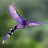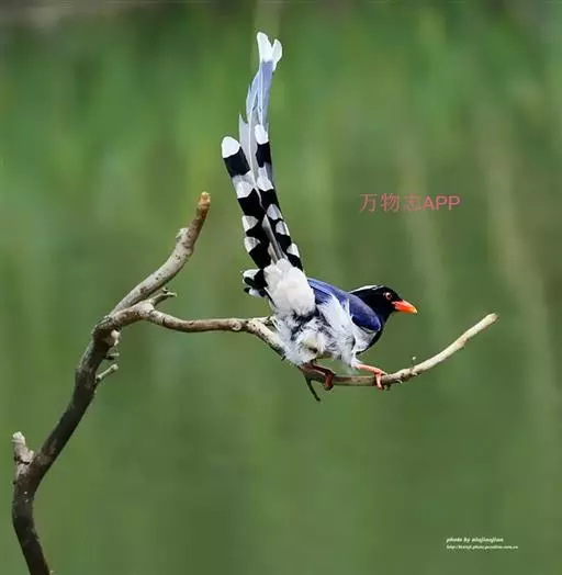 雌雄鸟体表羽色近似。体背蓝紫色;尾羽欣长,尤以中央两枚更加突出,尾端白色,配上红嘴、红脚,益显仪态庄重,雍容华贵,又有长尾蓝鹊之称。