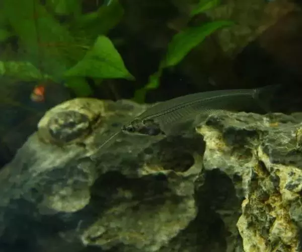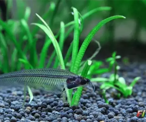 玻璃猫鱼身长10~12厘米,形似一片柳叶。头吻尖, 口上有长触须2根,常前伸或自由转动,探测水流、敌情、障碍和协助觅食。胸腹极短,头胸腹部只占全长的1/4。
