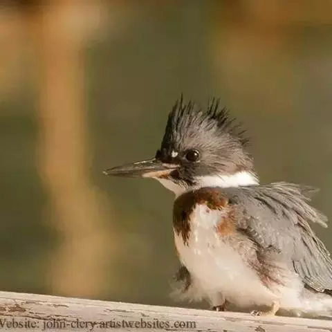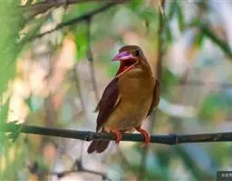棕腹鱼狗身长38 - 42 cm ,体重305-341 g。主体羽毛蓝色。头顶的冠羽竖起一个小尖峰…