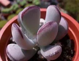 福娘为景天科银波锦属的肉质草本植物。对生的叶片呈短棒状,叶色灰绿,表覆白粉,叶缘外围镶着紫红色,…