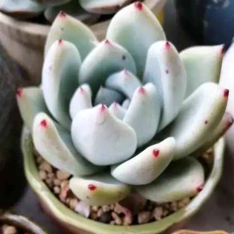 红稚莲是景天科石莲花属的多肉植物。叶片长匙形,先端稍尖,叶面光滑无粉,叶背有凸起的龙骨,…