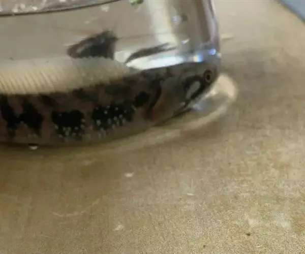 乌鳢体色呈灰黑色,体背和头顶色较暗黑,腹部淡白,体侧各有不规则黑色斑块,头侧各有2 行黑色斑纹。奇鳍黑白相间的斑点,偶鳍为灰黄色间有不规则斑点。