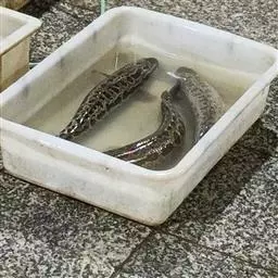 乌鳢俗称黑鱼,它生性凶猛,繁殖力强,胃口奇大,常能吃掉某个湖泊或池塘里的其他所有鱼类,甚至不放过自己的幼鱼。黑鱼还能在陆地上滑行,迁移到其他水域寻找食物,可以离水生活3天之久。是中国人的“盘中佳肴”。