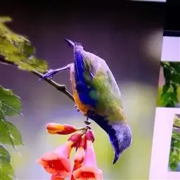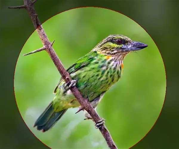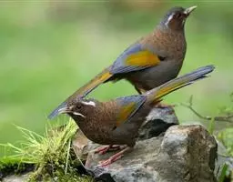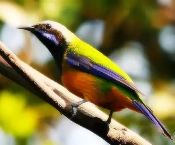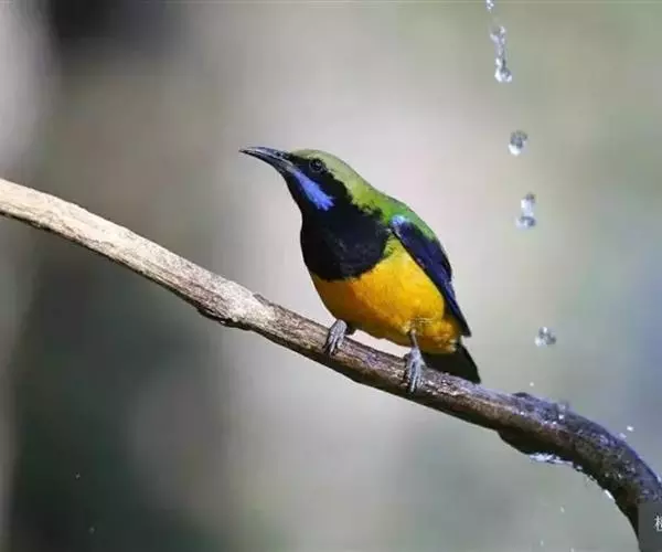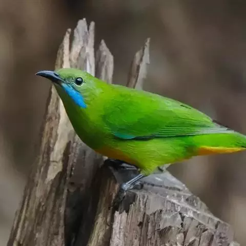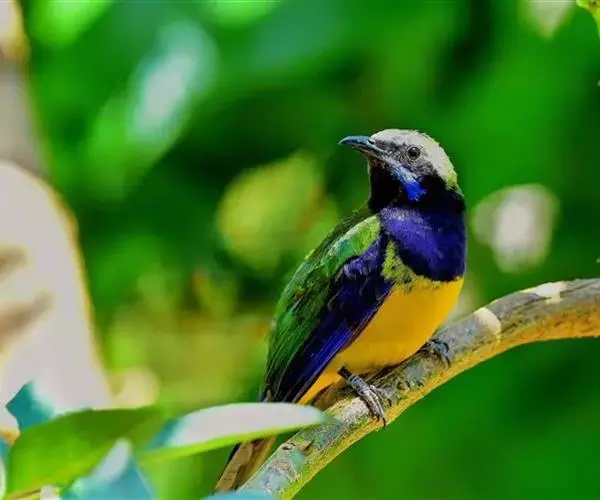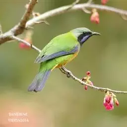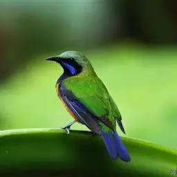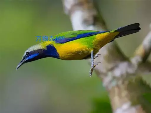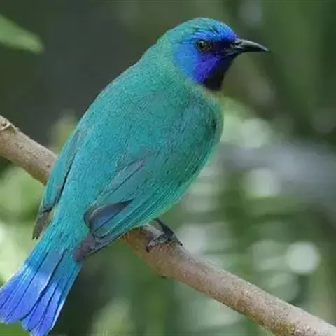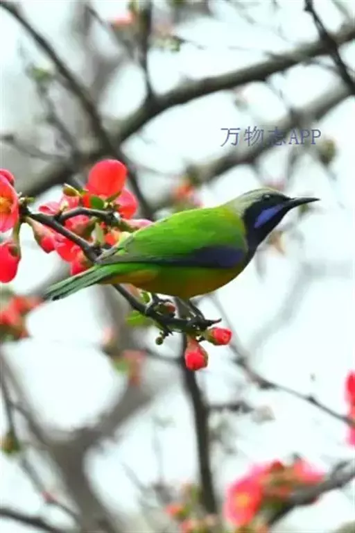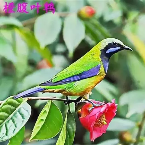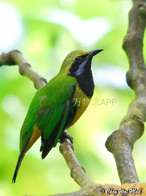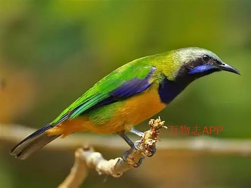 蓝翅叶鹎:小型鸟类,体长15-18厘米。雄鸟通体草绿色,尾蓝绿色,肩和翅亮蓝 色,胸缀有黄色,…