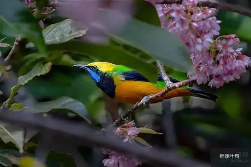 橙腹叶鹎(学名:Chloropsis hardwickii)体形大小和金额叶鹎相似,体长16~20厘米。额至后颈黄绿色,其余上体绿色,小覆羽亮钴蓝色,形成明显的肩斑。颏、喉、上胸黑色具钴蓝色髭纹,其余下体橙色。飞羽和尾羽雄鸟黑色、雌鸟绿色。