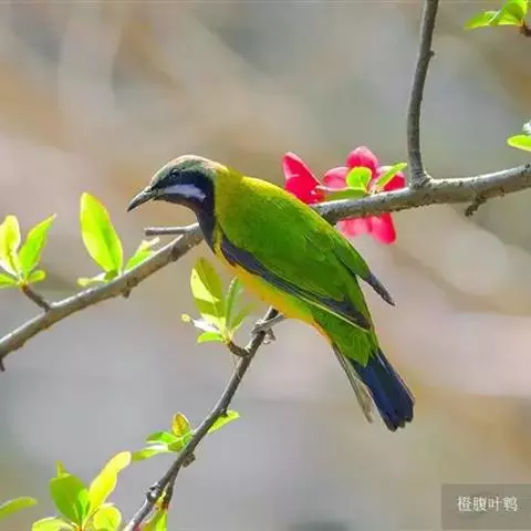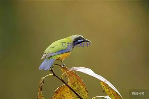 橙腹叶鹎体形大小和金额叶鹎相似,体长16~20厘米。额至后颈黄绿色,其余上体绿色,小覆羽亮钴蓝色,…