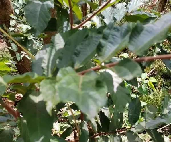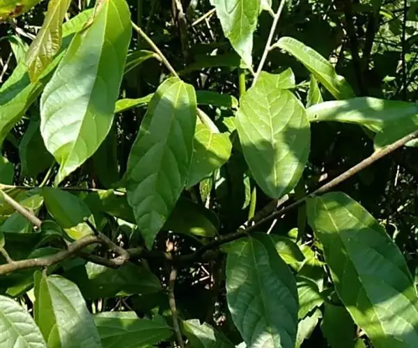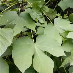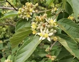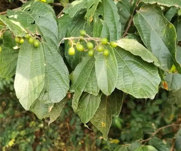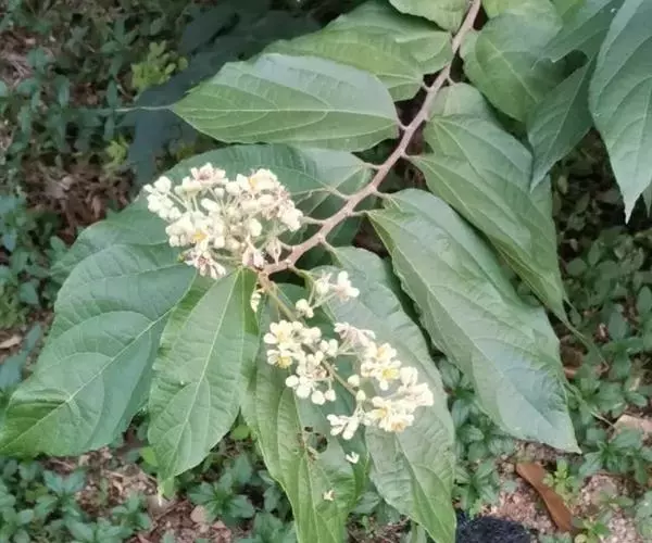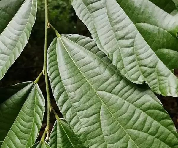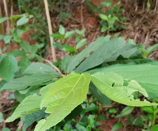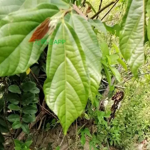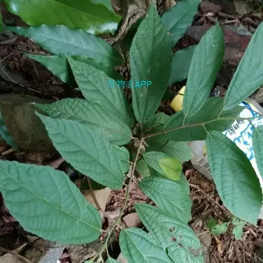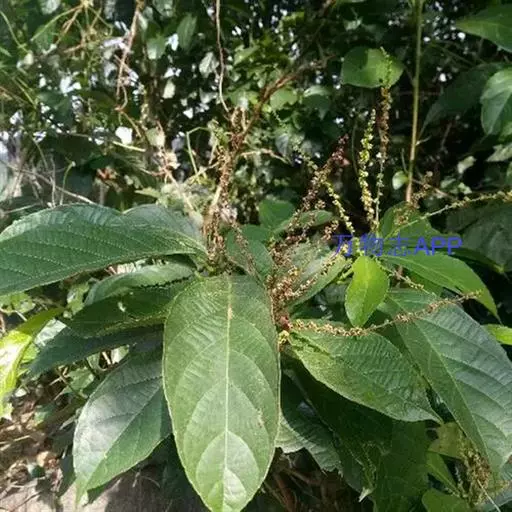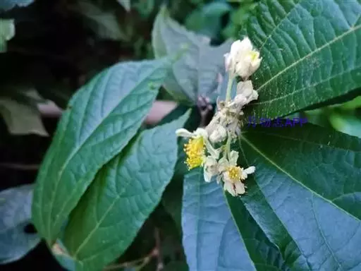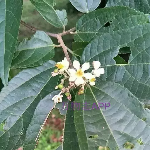 幼枝被毛。叶薄革质,卵状长圆形,长8-18厘米,先端渐尖,基部ff初两面被星状柔毛,后脱落无毛,3出脉的两侧脉由基部生出,向上过中部,边缘有细锯齿;叶柄长1-1.5厘米,托叶线状披针形,长5-7毫米。