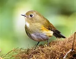 雌鸟上体橄榄褐色,尤以腰和尾上覆羽较棕,两翅褐色,羽缘棕色,中央一对尾羽棕色,其余尾羽褐色或暗褐色,羽缘棕色,颈侧有一辉蓝色斑。颏喉皮黄色,其余下体赭灰色或皮黄橄榄褐色。翅下覆羽和腋羽白色。