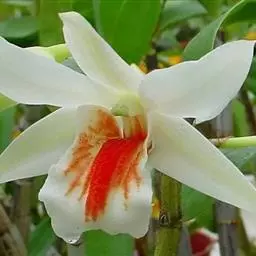 喉红石斛(学名:Dendrobium christyanum Rchb. f.):附生。茎丛生,直立,粗短,近棒状纺锤体。叶2-4枚,生于茎顶。总状花序顶生,花序轴长5-7毫米,具12朵花;花开展,除唇瓣的中裂片金黄色和侧裂片的内面橘红色外,均为白色;花瓣倒卵形,花径2-3厘米,白色,花瓣椭圆状矩圆形;花瓣3裂,中裂片边缘波状,侧裂片近半卵形;中裂片近肾形,下弯,先端浅2裂;唇瓣具橘黄色斑,唇盘上具3条粗糙的纵褶片。花期7月,常在夏季和早秋开花,花期长。
