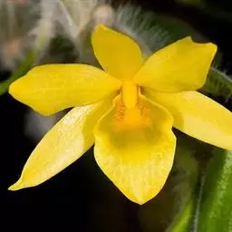 总状花序顶生,花序轴长5-7毫米,具12朵花;花序柄长2-3毫米;花苞片膜质,卵状披针形,长7-10毫米;花梗和子房长约2.5厘米;花开展,除唇瓣的中裂片金黄色和侧裂片的内面橘红色外,均为白色;中萼片卵状披针形,长约2.5厘米,宽约1厘米,先端急尖,具7条脉;侧萼片斜卵状披针形,长2.5厘米,宽1厘米,先端急尖,具7-8条脉;萼囊宽圆锥形,长约1厘米;花瓣倒卵形,花径2-3厘米,白色。