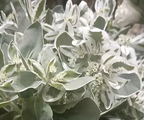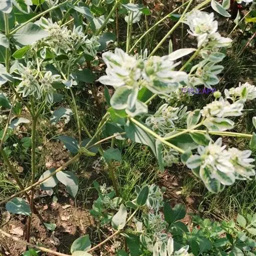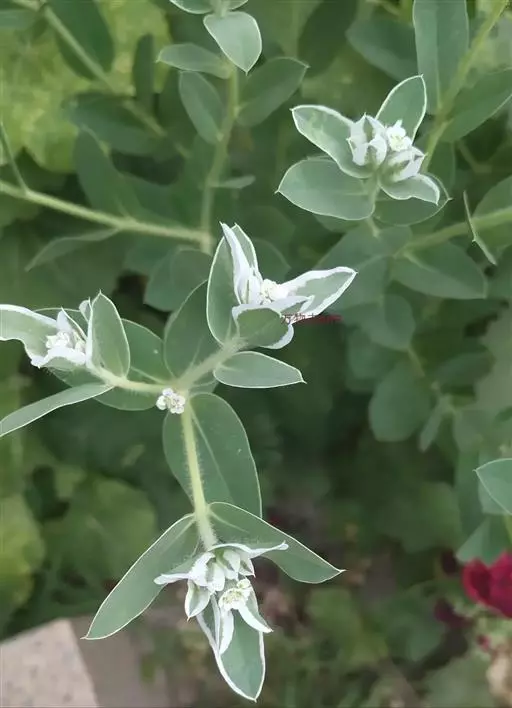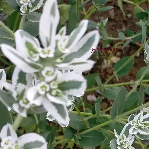 银边翠 一年生草本。根纤细,极多分枝,长可达20厘米以上,直径3-5毫米。茎单一,自基部向上极多分枝,高可达60-80厘米,直径3-5毫米,光滑,常无毛,有时被柔毛。叶互生,椭圆形,长5-7厘米,宽约3厘米,先端钝,具小尖头,基部平截状圆形,绿色,全缘;无柄或近无柄;总苞叶2-3枚,椭圆形,长3-4厘米,宽1-2厘米,先端圆,基部渐狭。全缘,绿色具白色边;伞幅2-3,长1-4厘米,被柔毛或近无毛;苞叶椭圆形,长1-2厘米,宽5-7(9)毫米,先端圆,基部渐狭,近无柄花序单生于苞叶内或数个聚伞状着生,基部具柄,柄长3-5毫米,密被柔毛;总苞钟状,高5-6毫米,直径约4毫米,外部被柔毛,边缘5裂,裂片三角形至圆形,尖至微凹,边缘与内侧均被柔毛;腺体4,半圆形,边缘具宽大的白色附属物,长与宽均超过腺体。雄花多数,伸出总苞外;苞片丝状;雌花1枚,子房柄较长,长达3-5毫米,伸出总苞之外,被柔毛;子房密被柔毛;花柱3,分离;柱头2浅裂。蒴果近球状,长与直径均约5.5毫米,具长柄,长达3-7毫米,被柔毛;花柱宿存;果成熟时分裂为3个分果爿。种子圆柱状,淡黄色至灰褐色,长3.5-4毫米,直径2.8-3毫米。被瘤或短刺或不明显的突起;无种阜。花果期6-9月。