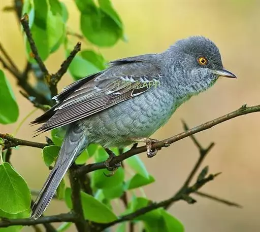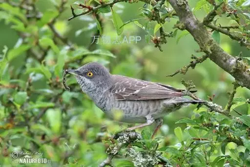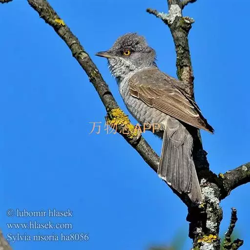 横斑林莺(学名:Sylvia nisoria):体长15-18厘米,是一种绿色及黄色雀鹎。翼上具两道明显近白色横纹,上体橄榄绿色,翼近黑而羽缘白,眼圈黄色,下体黄。雄鸟上体概呈灰褐色,在一定距离看起来有点泛蓝。下体白色,布满暗色波浪形横斑。雌鸟上体呈棕褐色,下体横斑仅限于两胁。一些雄鸟的头部及上背多偏黑色,其他似雌鸟。虹膜灰白色;嘴蓝黑色;脚蓝黑色。