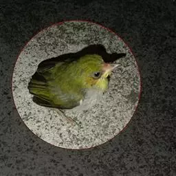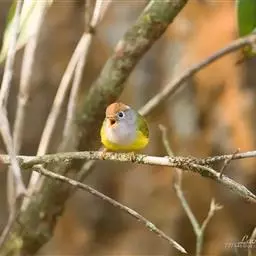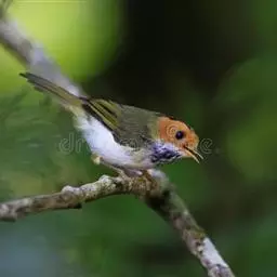 棕脸鹟莺:体长10厘米,是一种色彩亮丽而有特色的莺鸟。头栗色,具黑色侧冠纹。上体绿,腰黄色。下体白,…