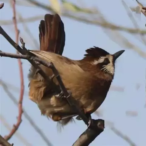 褐头凤鹛小型鸟类,体长12~13厘米。头顶有可竖立的红褐色羽冠,头侧、枕、颊、喉和下体白色,…