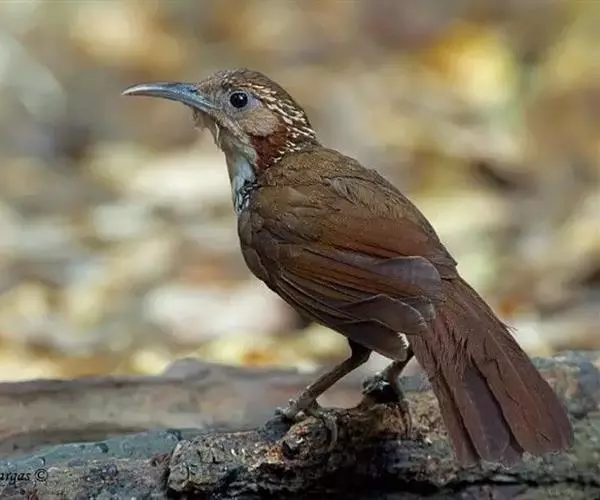 体大(27厘米)的褐色钩嘴鹛。嘴色深,褐色耳羽的后方具锈色块斑。亚种tickelli 的眼后具白色的长眼纹,颏、喉及胸中心白色,胸侧及两胁烟褐而具白色纵纹,尾下覆羽棕色。亚种hainanus多橄榄色。