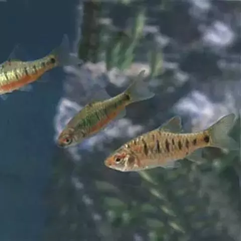 索姆三角灯鱼,学名为红身三角波鱼(Trigonostigmasomphongsi)。成鱼体长仅 三角灯鱼 达2cm左右,乃是三角灯鱼中体型最小的一个品种。整个鱼的外观呈一个纺锤的形状,背鳍、腹鳍、臀鳍以及尾鳍均为透明色,从胸腹部位至尾鳍有一条较为笔直的黑色横纹,周围的鱼鳞为金黄色,逐渐向四周隐没淡化。鱼身上半部分为略微透明的淡青色,鱼眼也为青色。索姆三角灯鱼整体色彩还是比较明媚鲜艳的,亮丽的金黄色搭配小巧灵敏的鱼身,具有一定观赏性的同时亦十分耐看。