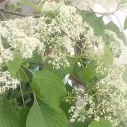 伞房状聚伞花序顶生,被灰白色贴生短柔毛,宽3.5-8厘米;总花梗圆柱形,长1.5-4厘米,略有稜角,密被贴生灰白色短柔毛;花小,白色至淡黄白色,直径9-10毫米;花萼裂片4,披针状三角形至尖三角形,长1毫米,长于花盘,淡绿色,外侧被紧贴的短柔毛;花瓣4,狭卵形至披针形,长6毫米,宽1.8毫米,先端急尖,质地稍厚,上面无毛,下面有贴生短柔毛:雄蕊4,长5毫米,花丝淡白色,长4毫米,无毛,花药长圆卵形,2室,淡黄白色,长2.4毫米,丁字形着生;花盘垫状,略有浅裂,厚约0.2毫米;子房下位,花托倒卵形,长2毫米,直径1.6毫米,密被灰白色平贴短柔毛,花柱棍棒形,长3.5毫米,淡黄白色,近于无毛,柱头小,截形,略有3(-4)个小突起;花梗细.圆柱形,长2-9毫米,被灰色及少数褐色贴生短柔毛。
