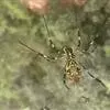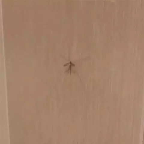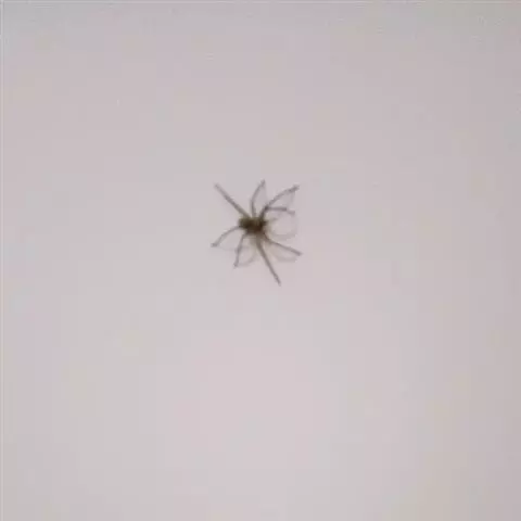 拟高脚蛛(雌) ,(高脚蛛科 / 拟高脚蛛属)体长约8-9mm,头胸部宽大,眼式2列,前后各4眼,前列前曲,体色黄褐色,腹部背面有一条不明显的中线,左右各有2枚小黑斑,腹背后半有一条横向的白色斑纹,各脚细长,黄褐色多毛,雄蛛体型瘦长,头胸宽大于腹部,中涡至下缘有一条醒目的纵斑。