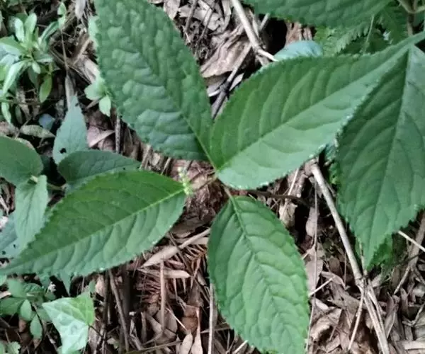 及己属多年生草本,高约30厘米。茎圆形,无毛。叶对生,4—6片,生于茎上部,卵形或卵状披针形,长4—8厘米,宽2.5—6厘米,顶端渐尖,基部楔形或阔楔形,边缘有圆锯齿,齿尖有1腺体。穗状花序单生或2—3分枝,长4—5厘米;苞片近半圆形,顶端有波状小齿;雄蕊3,下部合生,白色,中间一个雄蕊较长,花药2室,侧生的2个较短,花药l室;子房卵形。核果梨形,长约2毫米。花果期4—6月。