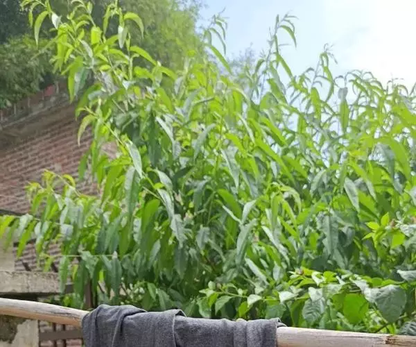叶革质,狭窄倒披针形,长7-15cm,宽1.5-3cm,先端尖,基部楔形,幼时上下两面均秃净,老叶上面深绿色,干后发亮,下面浅绿色,侧脉14-16对,在上面明显,在下面突起,网脉在下面稍突起,边缘密生小钝齿;叶柄长1-2cm。