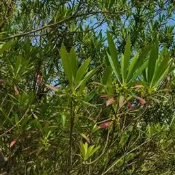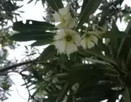 水石榕(学名:Elaeocarpus hainanensis Oliver),又名“水柳树”“海南胆八树”“海南杜英 ”,是杜英科,杜英属下的常绿小乔木。叶革质,聚生于枝顶,狭披针形至倒披针形;总状花序腋生,花白色,倒卵形;核果纺锤形,花期6-7月。