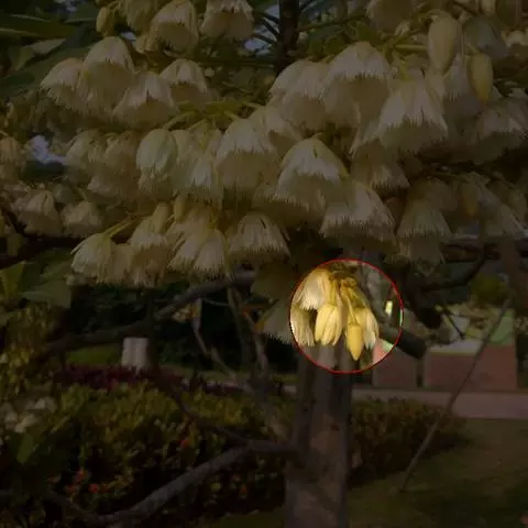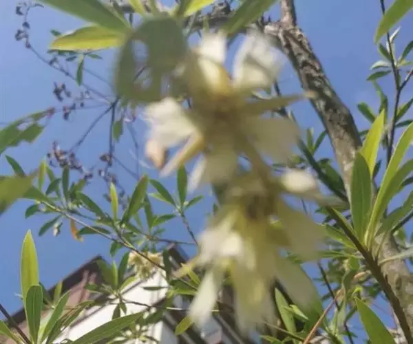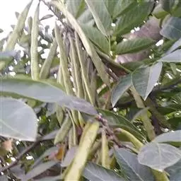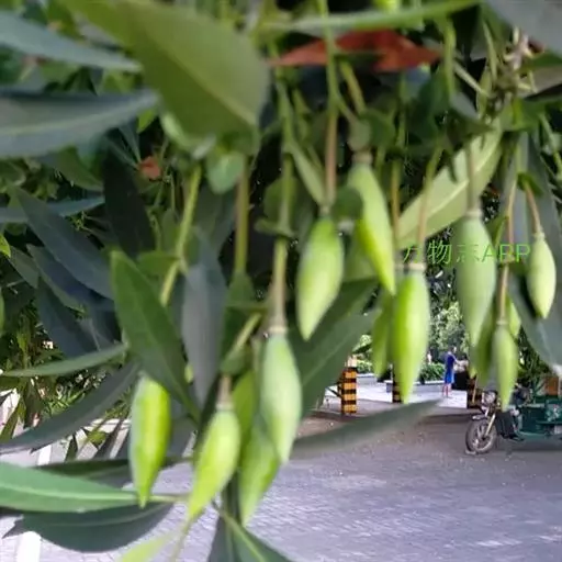 核果纺锤形,两端尖,长约4cm,中央宽1-1.2cm;内果皮坚骨质,表面有浅沟,腹缝线2条,厚1.5mm,1室;种子长2cm。花期6-7月。