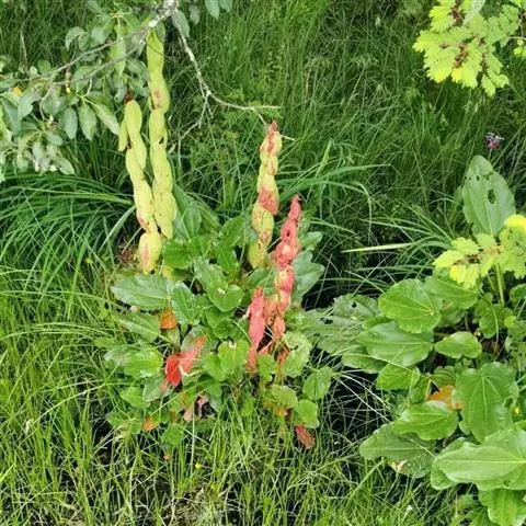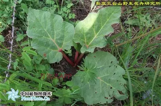 叶大、淡红色、掌状浅裂、心脏形,叶肉厚,叶面皱缩。叶柄长50-60cm,宽5-6cm,淡红色,密布红色细线,柔嫩叶柄呈鲜红色。6-7月自叶腋生花梗,高1m左右。花绿色,无花冠萼片6,雄蕊9。三角形有翼瘦果,9月成熟,果实各粒重20g左右,发芽期3年按叶柄颜色分为红色和绿色两个类型。