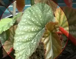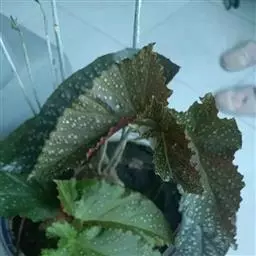 真菌病害,由葡萄孢菌引起的灰霉病症状:秋海棠叶片灰霉病经常发植株的下部,尤其是根茎处与基质接触的地方更容易感染病菌,被水浸润的病斑很快会扩散到整个叶整个植株,受害区域呈现坏死斑点,逐渐由褐色转变为黑色。当夜间温度较低、白天温度较高而且湿高时,病原孢子生长加快,受害的叶片上会长出灰绿色的霉状物。