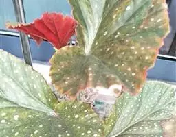 细菌性病害由斑点病菌引起的叶斑病症状:秋海棠非常容易被该种菌所侵染,但是许多生产者对之没有足够的重视,并不认为这是一种病症,因为叶片边缘坏死和叶片斑点是最常见的,几乎所有类型的秋海棠都曾经出现过这种情况。