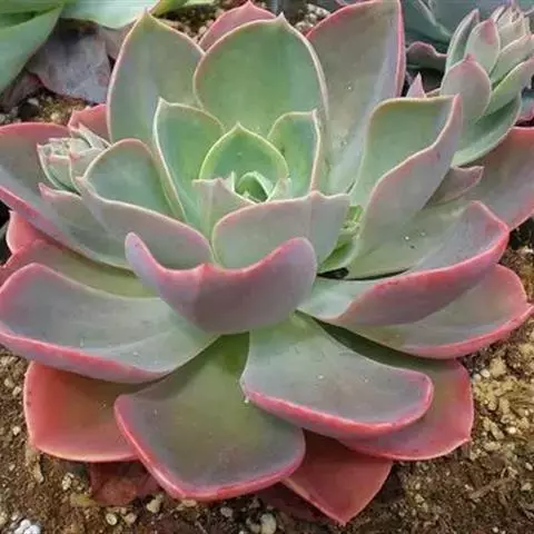 小红衣是景天科、拟石莲花属的一种多肉植物。叶片匙形,扁平细长,叶表具白粉,有明显的半透明边缘,…