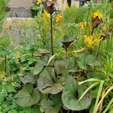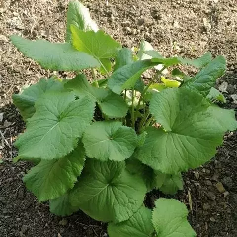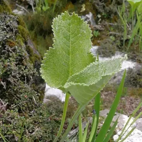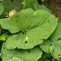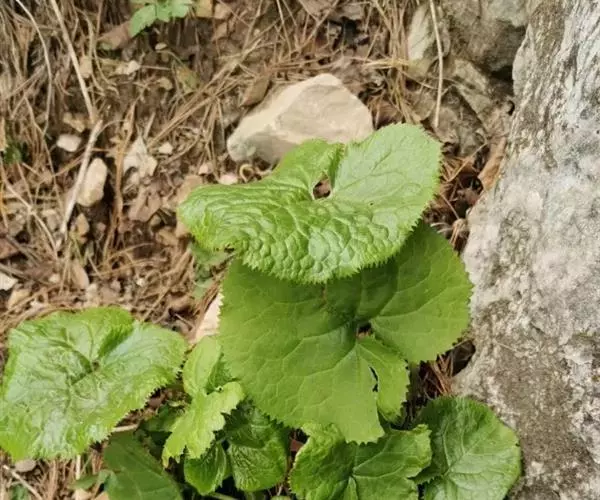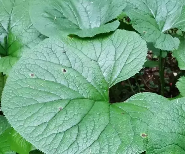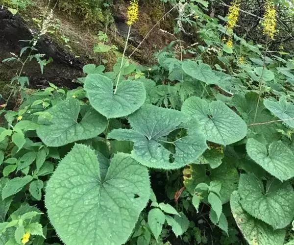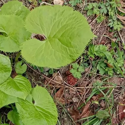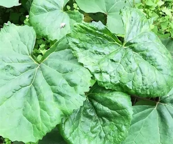 丛生叶和茎下部叶具柄,柄长14-39厘米,光滑,基部鞘状,叶片卵状心形、三角状心形、肾状心形或宽心形,长3.5-2 0厘米,宽4.5-29厘米,先端圆形或钝,边缘具整齐的细齿,基部心形,弯缺长为叶片的1/3至1/4,两侧裂片长圆形或近圆形,有时具大齿,两面光滑,叶脉掌状;茎中部叶与下部者同形,具短柄,柄长3-14厘米,鞘膨大,长3-6厘米;最上部叶仅有叶鞘,鞘缘有时具齿。