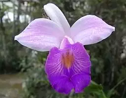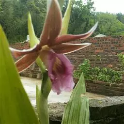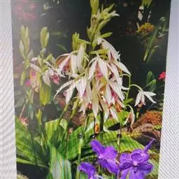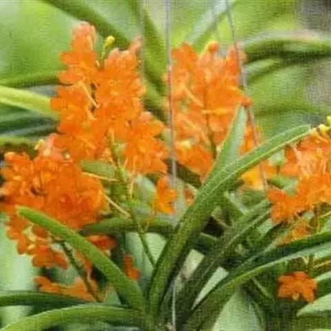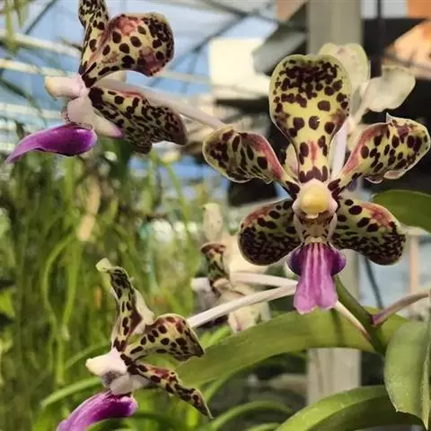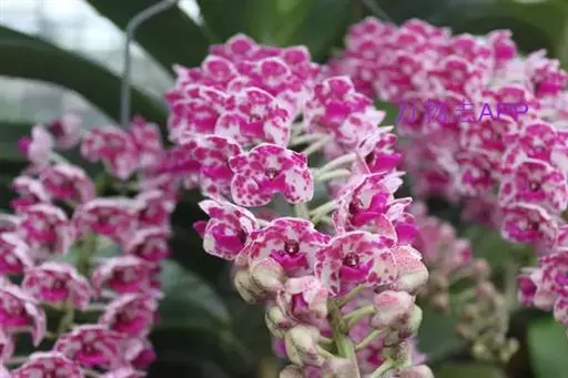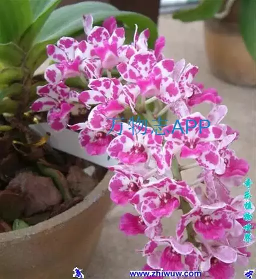 海南钻喙兰(学名:Rhynchostylis gigantea (Lindl. ) Ridl.):根肥厚,粗达10毫米。茎直立,粗壮,具数节,不分枝,具多数二列的叶,被宿存的叶鞘所包。叶肉质,彼此紧靠,宽带状,外弯。花序腋生,下垂,2-4个,通常比叶短;花白色带紫红色斑点,质地较厚,开展;萼片近相似,椭圆状长圆形;花瓣长圆形,比萼片小,先端钝,基部收狭,具5条主脉;唇瓣肉质,深紫红色,贴生在蕊柱足上,向外伸展,近倒卵形,长约17毫米,宽12毫米,基部具一对脊突,上部3裂。蒴果倒卵形,具数个棱。花期1-4月,果期2-6月。