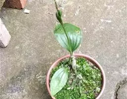 方法一 准备好兰盆及植料后,将兰株倒拿(根在上,叶在下)放于水龙头下以慢水冲洗,但水压切忌过强,以免伤兰根及叶子。用拇指和食指抓住兰头,小指抵住盆缘,用竹筷将根固定,当放入盆内时,尽量不要让根接触到盆壁。将豆粒大的混合石砾倒入盆底至三分之一处。然后倒入中粒植料至五分之四处,填实和尽量不要留下空间。将竹筷拔出,并摇实盆中植料。填实植料后,再用大粒植料埴入至距盆缘1.5厘米处。最后再倒入豆粒大植料,以将假鳞茎全部埋入土中为度,然后充分摇实。用压土工具轻压植料,并将表面弄平。种植完毕后,植料在盆中以中央稍高为好。