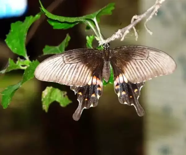 玉带凤蝶成虫体长25-28mm,翅展77-95mm 。全体黑色。头较大,复眼黑褐色,触角棒状,胸部背有10小白点,成2纵列。