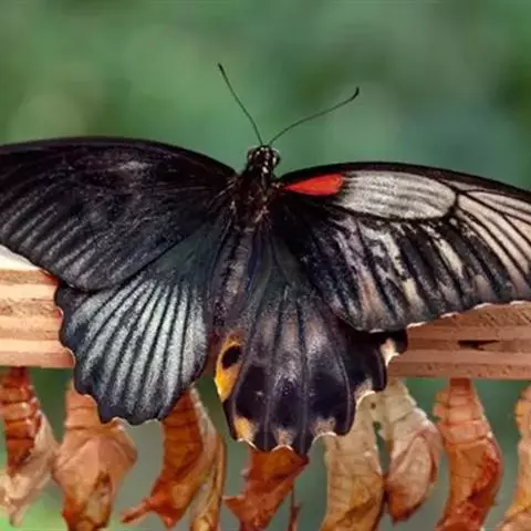 玉带凤蝶蛹长30mm,体色多变,有灰褐、灰黄、灰黑、灰绿等,头顶两侧和胸背部各有l突起,胸背突起两侧略突出似菱角形。