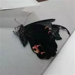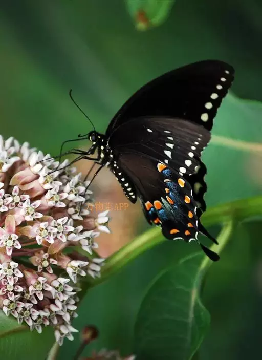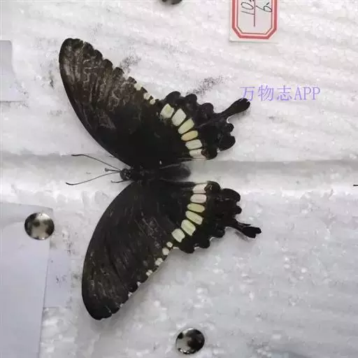 玉带凤蝶翅展77-95mm,雌雄异型,雌蝶有多个型态,斑纹变化很大,翅黑色。雄蝶横贯全翅似玉带,故得名。
