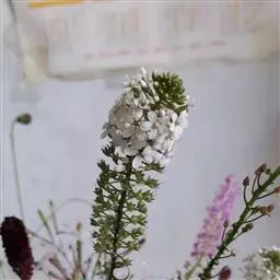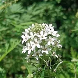 总状花序顶生,初时因花密集而成圆头状,后渐伸长成圆锥形,通常长3-12厘米,直立;苞片匙形,花序下部的几与茎叶相同,向上渐次缩小;花梗与苞片近等长或稍短;花萼长4-7毫米,分裂近达基部,裂片广披针形至椭圆形,先端锐尖或圆钝,周边膜质,中肋显著,背面有黑色粒状腺点;花冠白色,长约9毫米,基部合生部分长达2毫米,裂片舌状长圆形,先端钝,直立;雄蕊比花冠短,花丝贴生至花冠裂片的中下部,分离部分长约1.5毫米;花药长圆形,长约1.2毫米,药隔顶端具硬尖头;花粉粒具3孔沟,近长球形[(26-30) × (20-22)微米],表面具不明显的网状纹饰;子房圆锥形,上部渐狭与花柱相连;花柱长约4毫米。