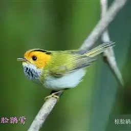 棕脸鹟莺:体长10厘米,是一种色彩亮丽而有特色的莺鸟。头栗色,具黑色侧冠纹。上体绿,腰黄色。下体白,…