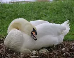黑天鹅在卵产齐后开始孵化,一般雌雄轮流孵化,但以雌鸟为主,雌雄轮换没有明显规律。一只孵化时,另一只担任警戒工作。繁殖期为每年9月至来年5月前。营巢于水边隐蔽处。每窝产卵4-8枚。孵化期为35-38天。雏鸟在2-3周内被孵化。雏鸟出壳前一天可听到壳内“吱吱”叫声和啄壳声,叫声由弱到强,数小时后,啄壳声逐渐增强,频率随之增加。破壳位置距离卵钝端1.1-1.6厘米横径处,先呈不规则型裂纹,后以小洞破壳。当破壳缝达周长的三分之二时,幼雏可把卵壳顶开顺利脱出。 [4-5]