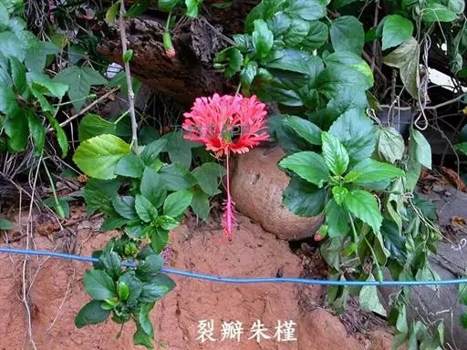 吊灯扶桑,又名假西藏红花、灯笼花。常绿直立灌木,高达3m。小枝细瘦,常下垂,平滑无毛。叶互生;叶柄长1-2cm,上面被星状柔毛;托叶钻形,长约2mm,常早落;叶片椭圆形或长圆形,长4-7cm,宽1.5-4cm,先端短尖或短渐尖,基部钝或宽楔形,边缘具齿缺,两面均无毛。花单生于枝端叶腋间,花梗细瘦,下垂,长8-14cm,平滑无毛或具纤毛,中部具节;小苞片5,极小,披针形,长1-2mm,被纤毛;花萼管状,长约1.5cm,疏被细毛,具5浅齿裂,常一边开裂;花瓣5,红色,长约5cm,深细裂作流苏状,向上反曲;雄蕊柱长而突出,下垂,长9-10cm,无毛;花柱枝5,无毛。蒴果长圆柱形,长约4cm,直径约1cm。花期全年。