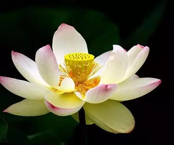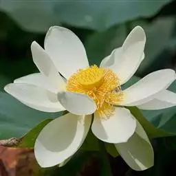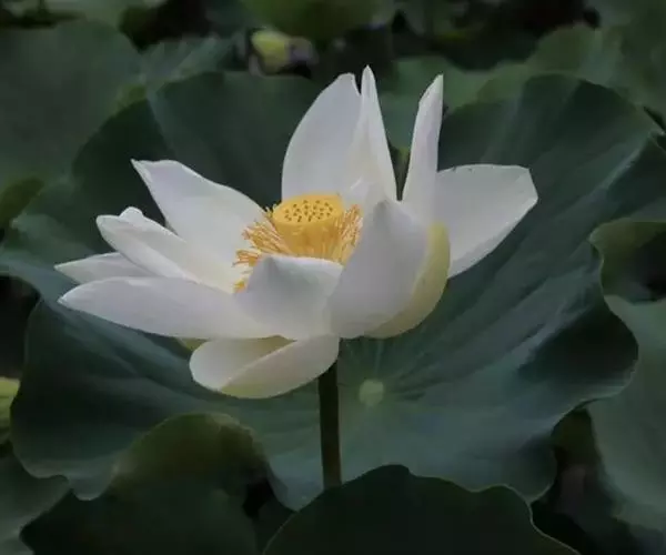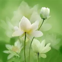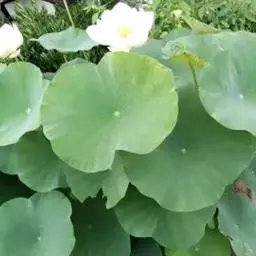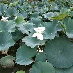白色莲花 花色丰富,主要有红色、粉红色、白色、绿色、黄色等,花型主要有单瓣,多瓣,重瓣和千瓣。叶片呈深绿色或黄绿色,全缘盾状,表面有蜡质附着,因此水很难吸附其上而呈水珠状。莲的叶片有三种类型,有初生浮于水面的钱叶,有着生在藕带的节间处、浮于水面且叶面积略大的浮叶,有着生与藕带节间处、挺出水面的立叶。莲的叶柄从淤泥中地下茎节间处抽出,表面多有倒刺;莲的根为须状根,围绕着地下茎节间生长。莲的地下茎及叶柄内均有通气的孔道。莲地下茎顶端的顶芽,又称为藕苫,其抽生出新的地下茎节间,被称为藕带。