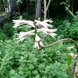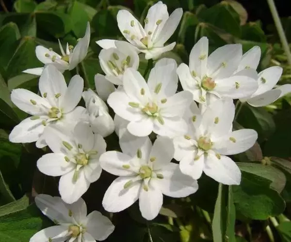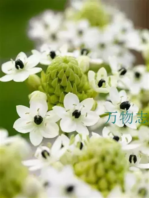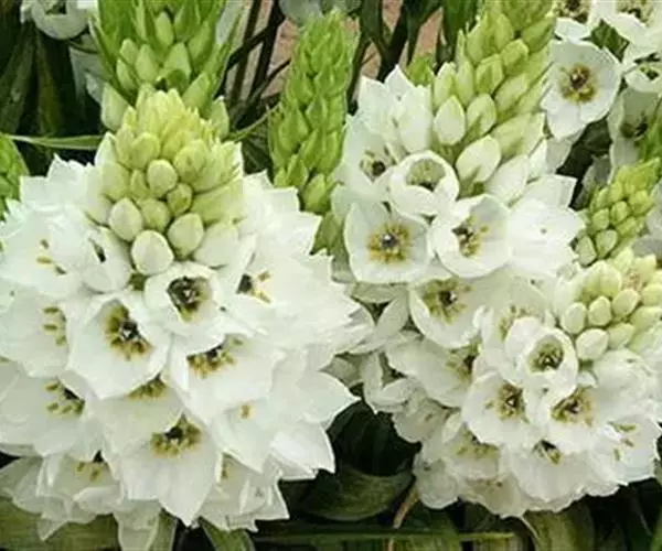 球根植物,叶7-8,无毛,末端渐细,长60cm。花25朵簇生于长茎,茎圆柱形。下部生长的花有长柄,所有的柄都有苞叶包裹,苞叶先端尖,绿色,略带白色,花宽为50mm ,被片6,纯白色,子房位于中间,紫黑色,形成鲜明的对比。蒴果,圆柱形。
