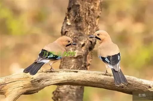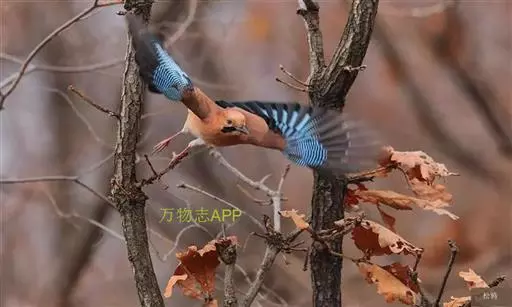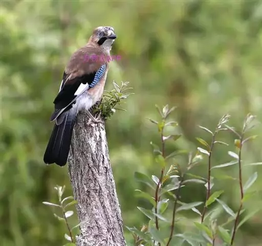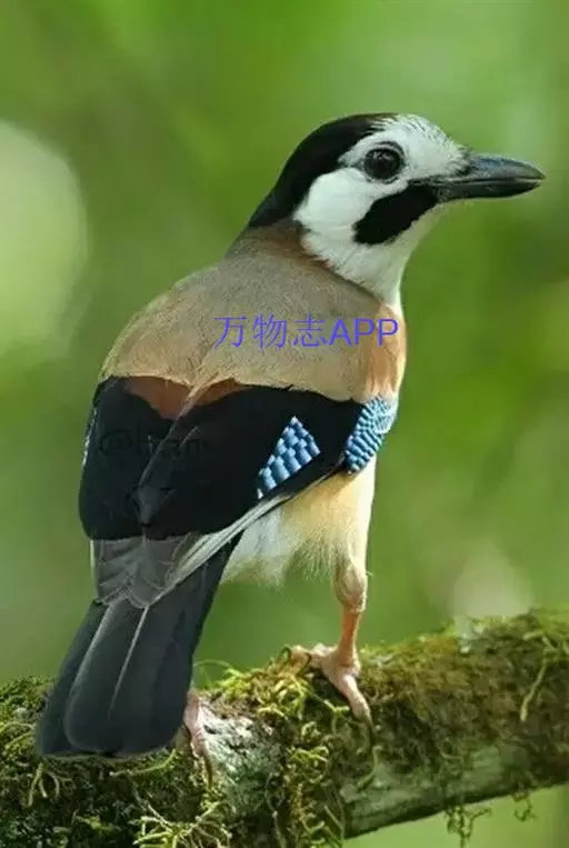 松鸦(学名:Garrulus glandarius):是中型鸟类,共有34个亚种。体长28-35厘米。翅短,尾长,羽毛蓬松呈绒毛状。头顶有羽冠,遇刺激时能够竖直起来。羽色随亚种而不同,云南亚种额白,头顶黑色。其余亚种额和头顶红褐色,口角至喉侧有一粗著的黑色颊纹。上体葡萄棕色,尾上覆羽白色,尾和翅黑色,翅上有辉亮的黑、白、蓝三色相间的横斑,极为醒目。