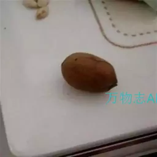 种子椭圆形或长卵圆形,长2~4cm,直径1.5~2.5cm。外表面黄棕色至深棕色,微具纵棱,一端钝圆,具一椭圆形种脐,色稍淡,较平滑,另端略尖。种皮坚而脆,破开后可见种仁1枚,卵圆形,外胚乳膜质,灰褐色,极皱缩,内胚乳肥大,黄白色,质坚实,富油性。气微,味微甜涩。炒熟后具香气。