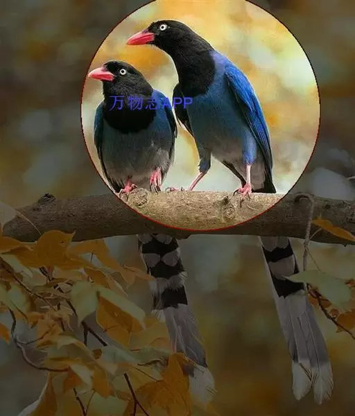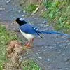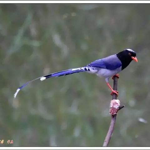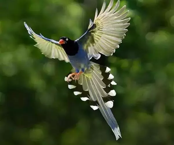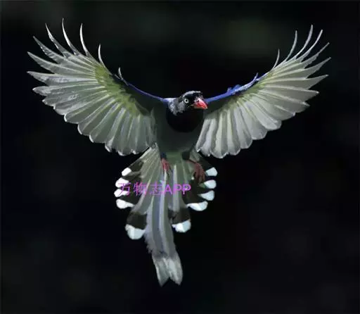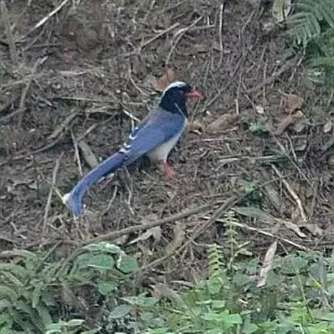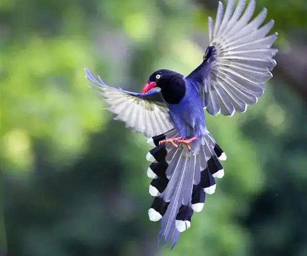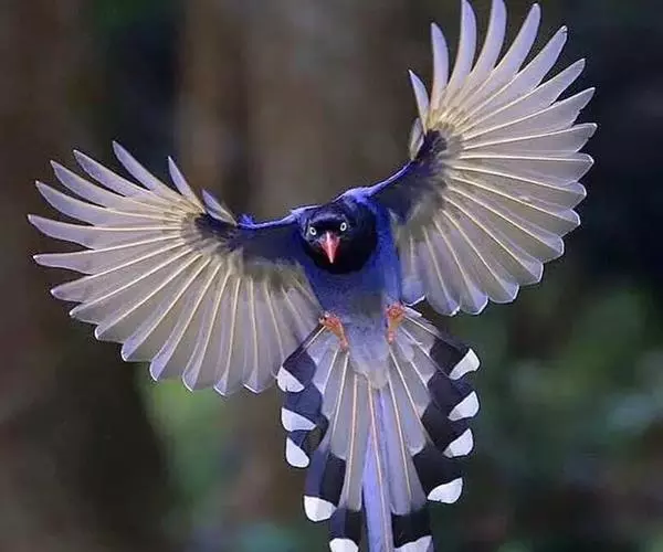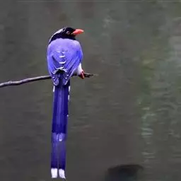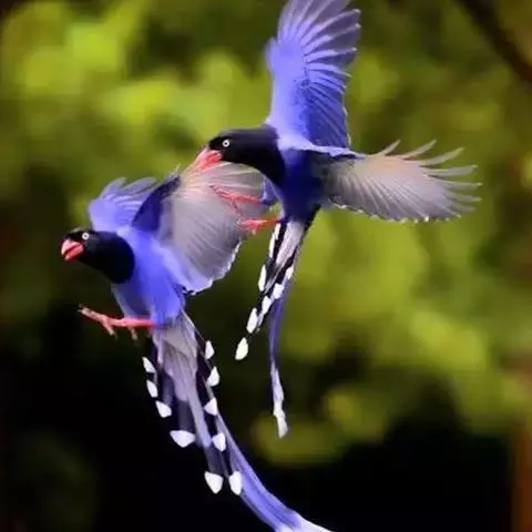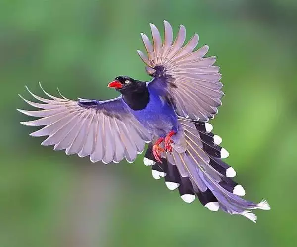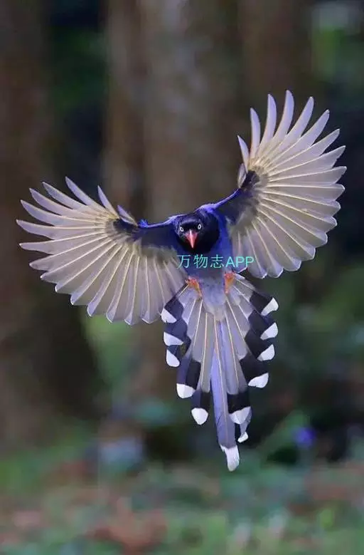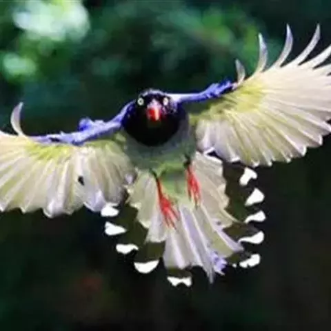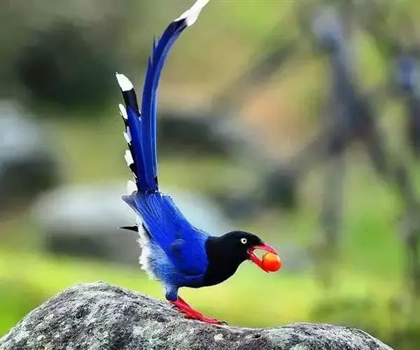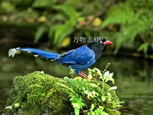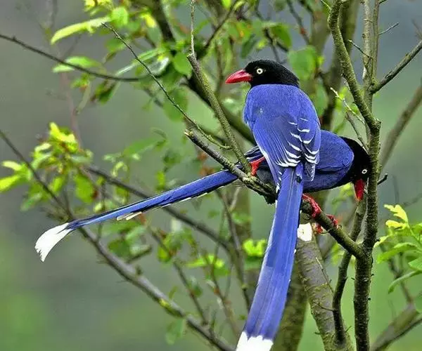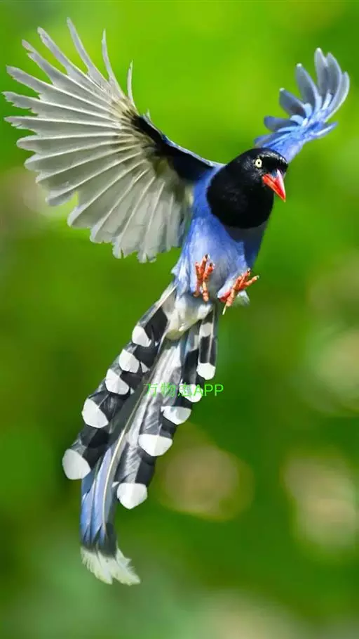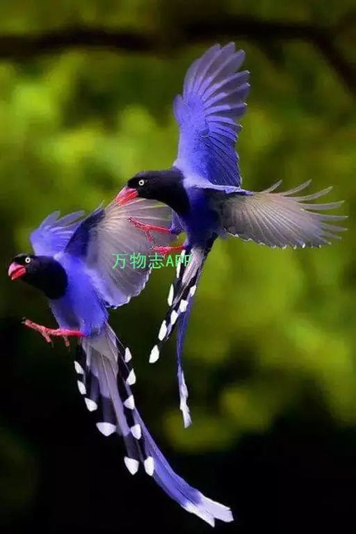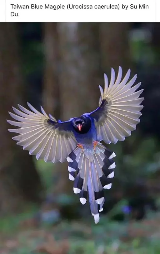 台湾蓝鹊(学名:Urocissa caerulea):体长64至65厘米,翼展18至21厘米,尾长约40厘米,尾羽长占了总体长的三分之二。头、脸、颈、喉、胸都是黑色,黄色的眼珠包围黑色的瞳孔,鲜红色的鸟喙、双脚,身体上半部可目视处及下半部的腹部呈鲜蓝色,有十二根尾羽,最长二羽为蓝根白尾,其于为黑根白尾,左右对称。下腹和尾下覆羽灰白色。