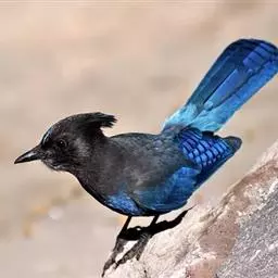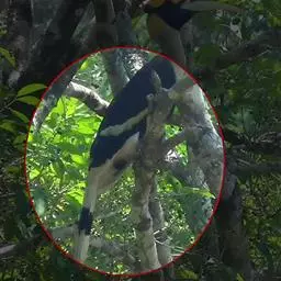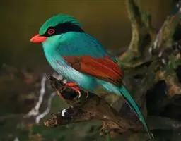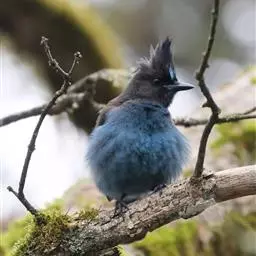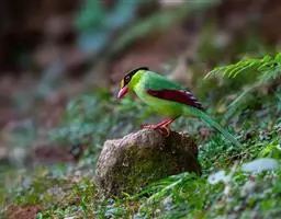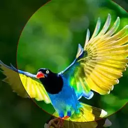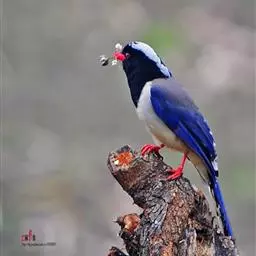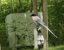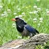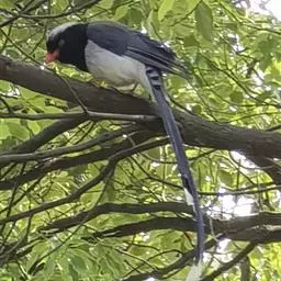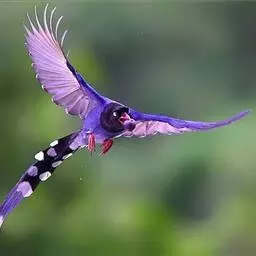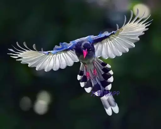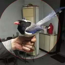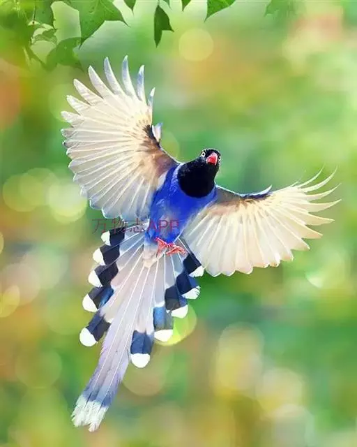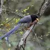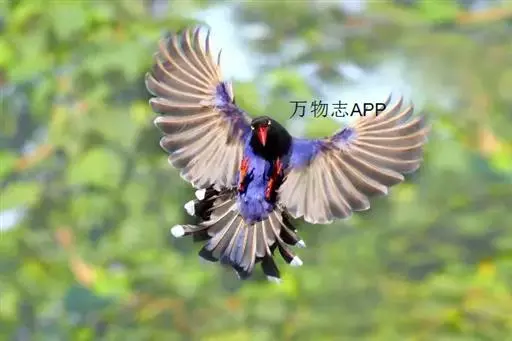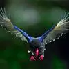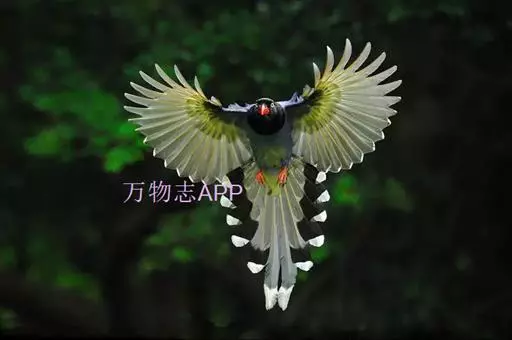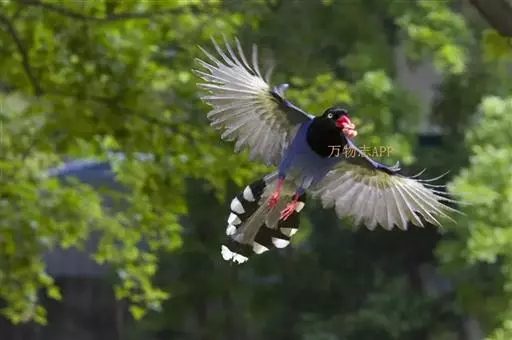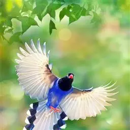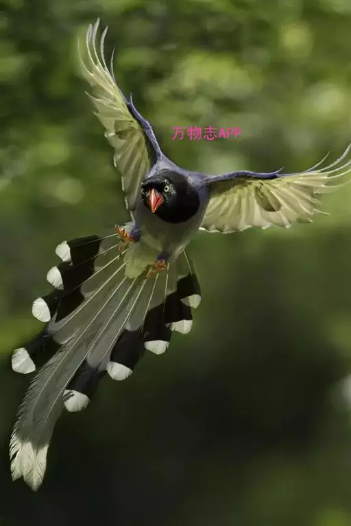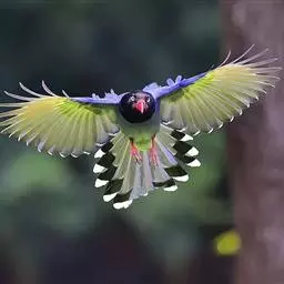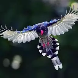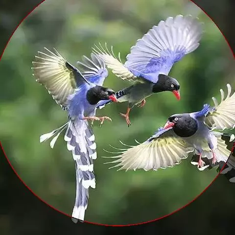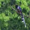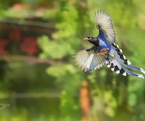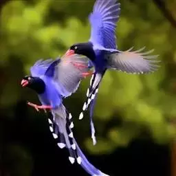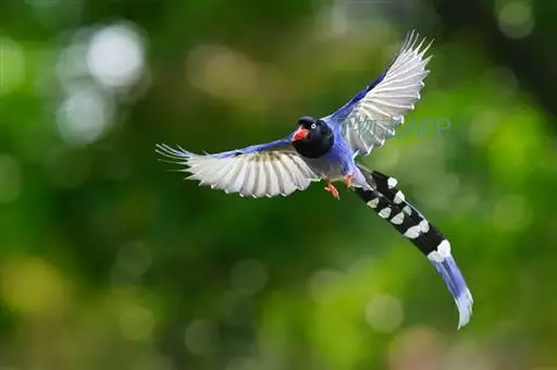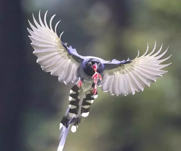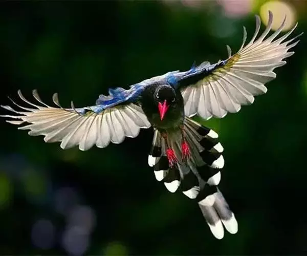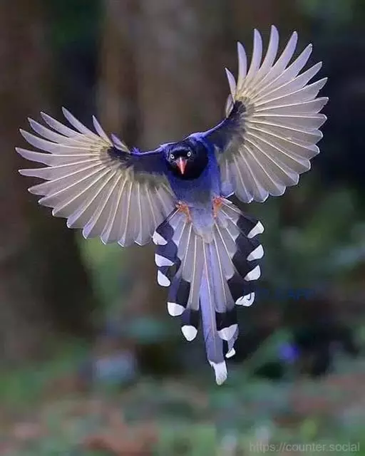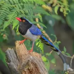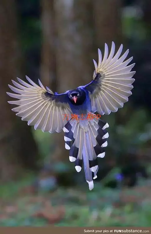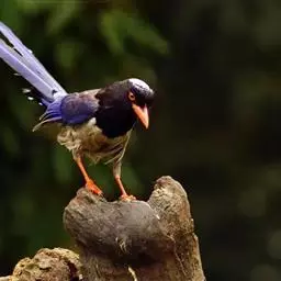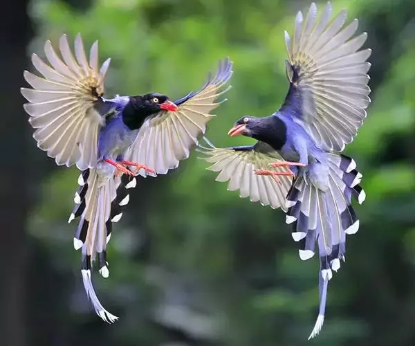 台湾蓝鹊(学名:Urocissa caerulea):体长64至65厘米,翼展18至21厘米,尾长约40厘米,尾羽长占了总体长的三分之二。头、脸、颈、喉、胸都是黑色,黄色的眼珠包围黑色的瞳孔,鲜红色的鸟喙、双脚,身体上半部可目视处及下半部的腹部呈鲜蓝色,有十二根尾羽,最长二羽为蓝根白尾,其于为黑根白尾,左右对称。下腹和尾下覆羽灰白色。