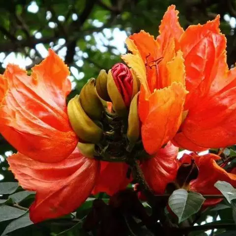 顶生疏散的短圆锥花序,花序轴长15-20厘米。花萼钟状,长3厘米,分裂至中部,裂片披针形,长约1.5厘米。花冠内面鲜红色,外面橙黄色,长约5厘米,裂片半圆形。雄蕊着生于花冠筒近基部,花丝线形,细长,长2-2.5厘米,花药黄色,个字形着生。花柱线形,长约3厘米,柱头扁平,2裂。蒴果顶端钝。花期5-8月。