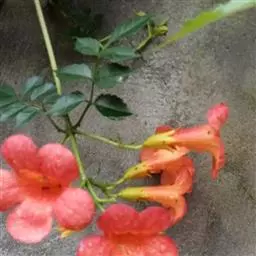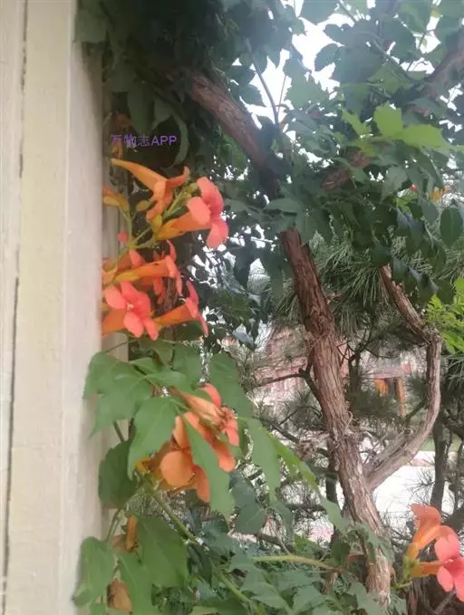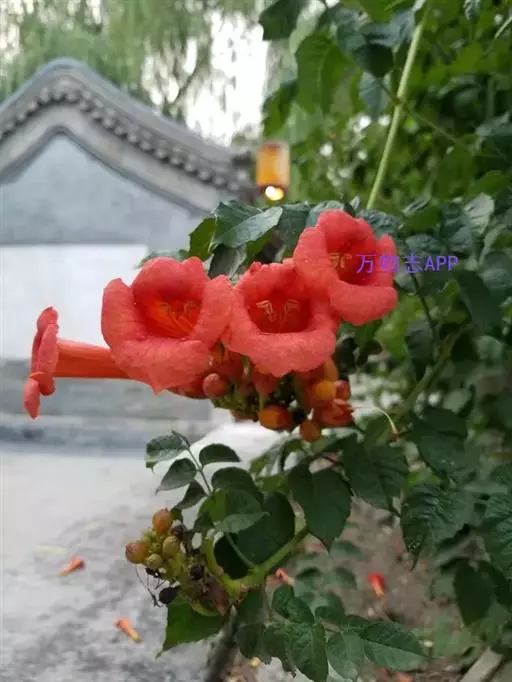 凌霄(学名Campsis grandiflora (Thunb.) Schum.),别名紫葳、五爪龙、红花倒水莲、倒挂金钟、上树龙、上树蜈蚣、白狗肠、吊墙花、堕胎花、芰华、藤罗花。落叶攀援藤本,茎木质,表皮脱落,枯褐色,以气生根攀附于它物之上。叶对生,为奇数羽状复叶顶生疏散的短圆锥花序。花萼钟状,花冠内面鲜红色,外面橙黄色。雄蕊着生于花冠筒近基部,花丝线形,细长。花药黄色,个字形着生。花柱线形,柱头扁平。蒴果顶端钝。花期5-8月。